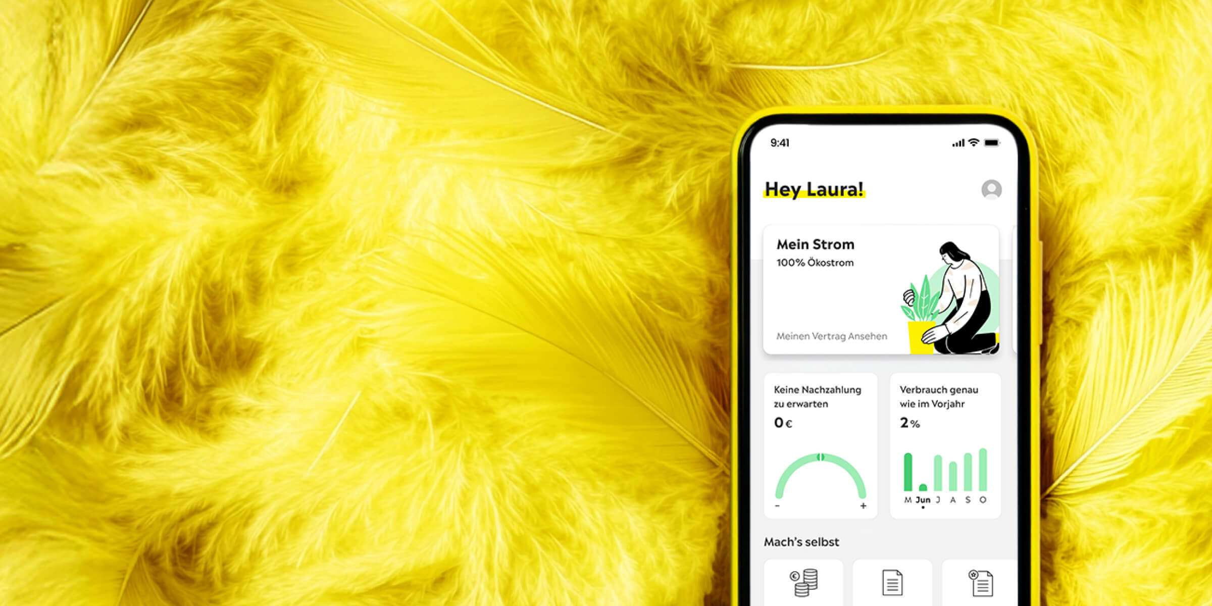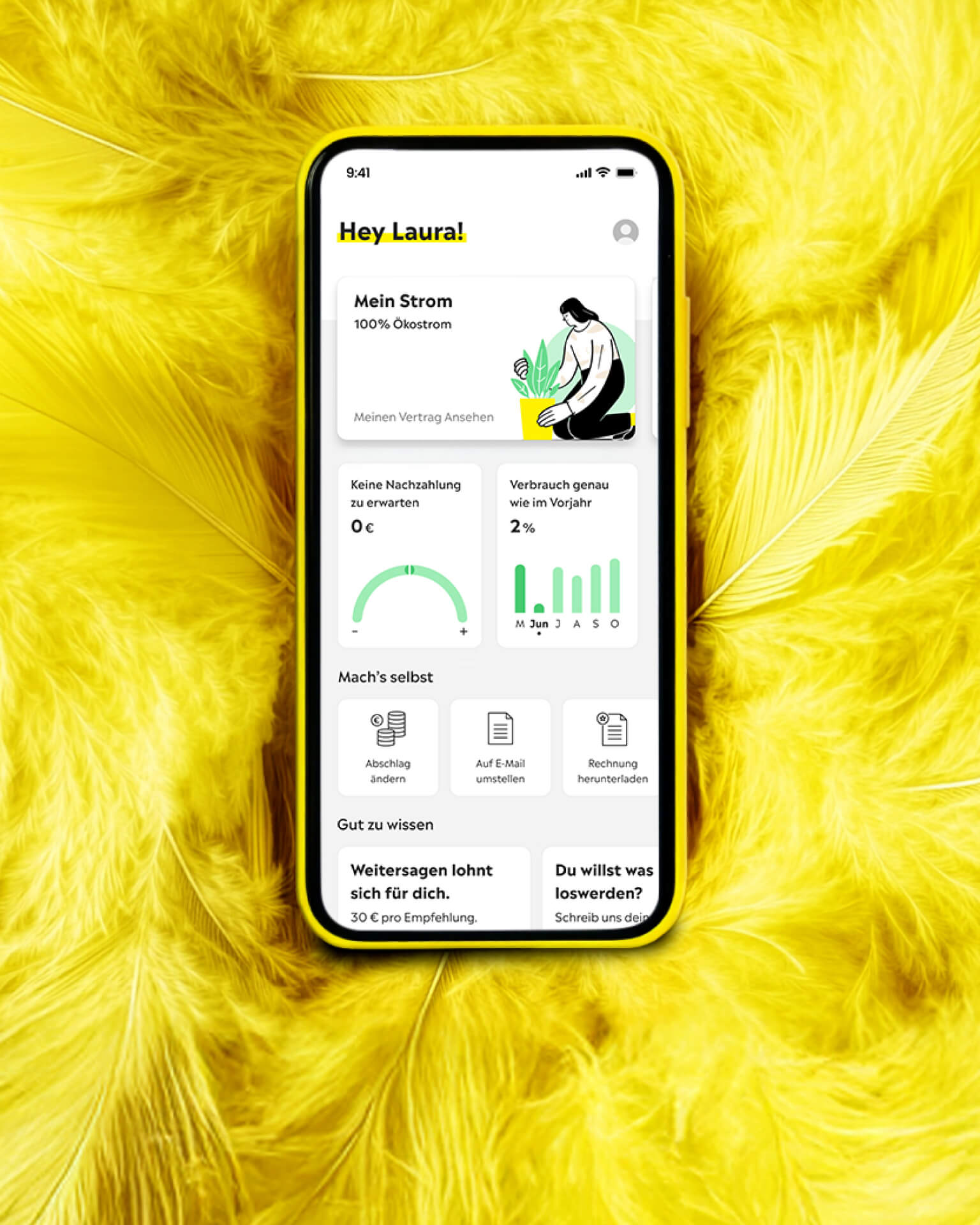 Verbrauch checken, Abschlag anpassen und alles rund um deinen Vertrag ganz easy selbst regeln. Kein Papierkram, keine Wartezeiten – einfach App an und let's go. So behältst du jederzeit den Überblick, digital, nachhaltig und günstig. Denn gute Energie ist die, die du nicht verbrauchst.